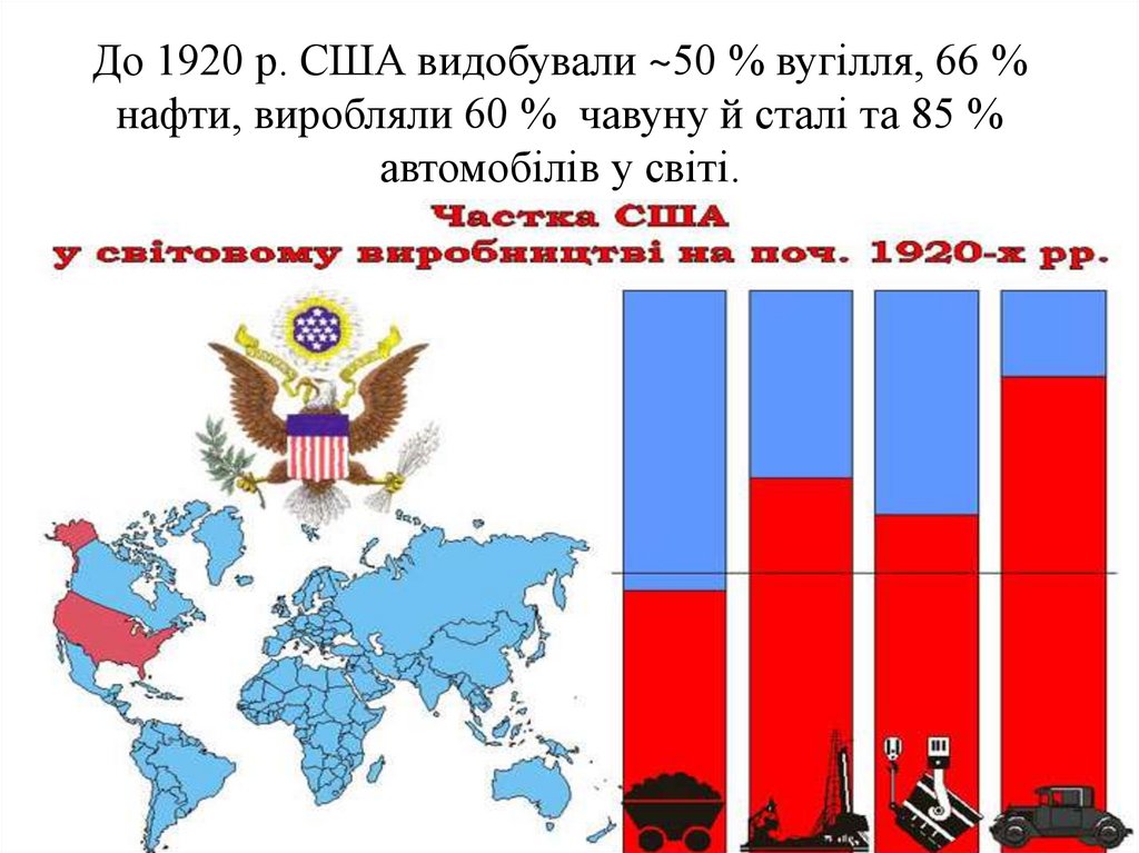 До 1920 р. США видобували ~50 % вугілля, 66 %нафти, виробляли 60 % чавуну й сталі та 85 %