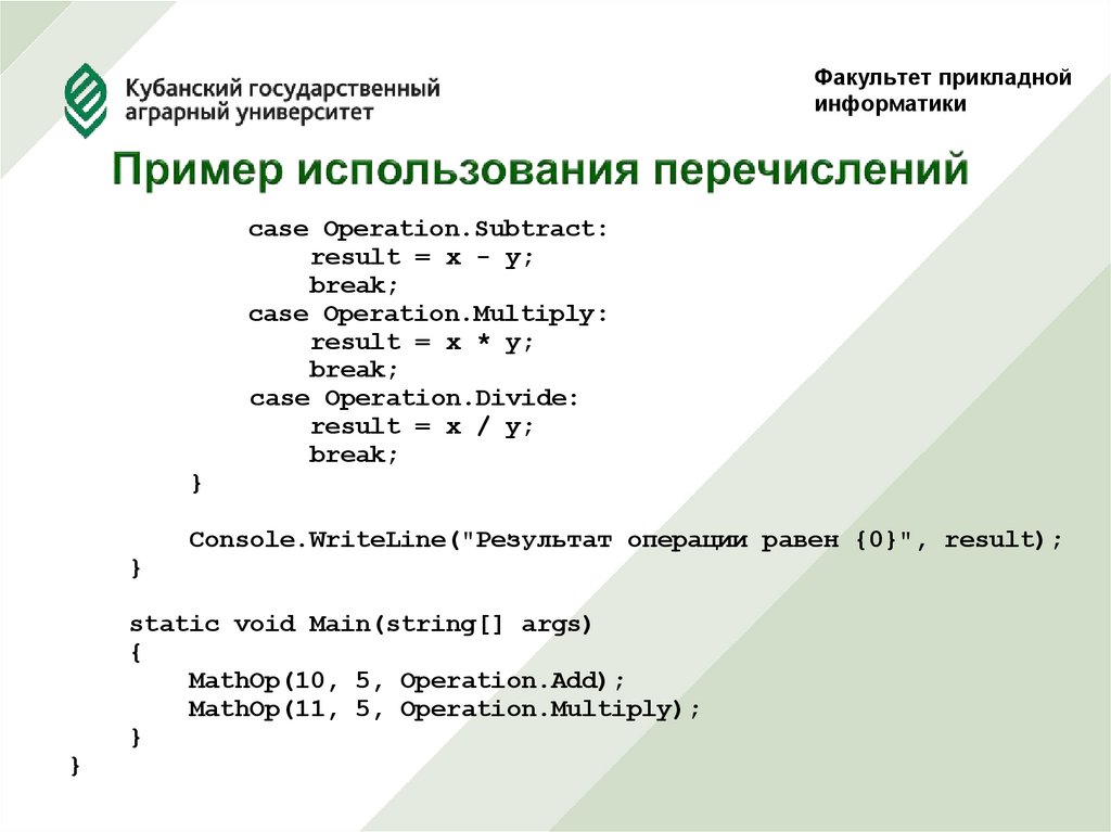 Console.WriteLine("Результат операции равен {0}", result);