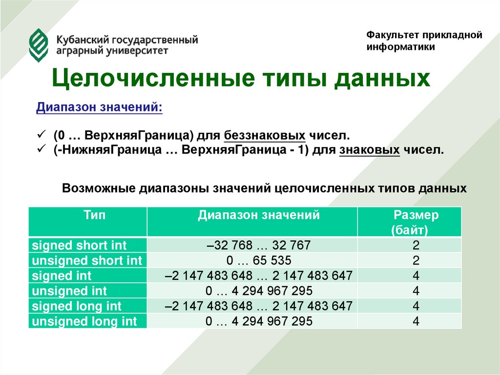 Целочисленные типы данныхДиапазон значений: