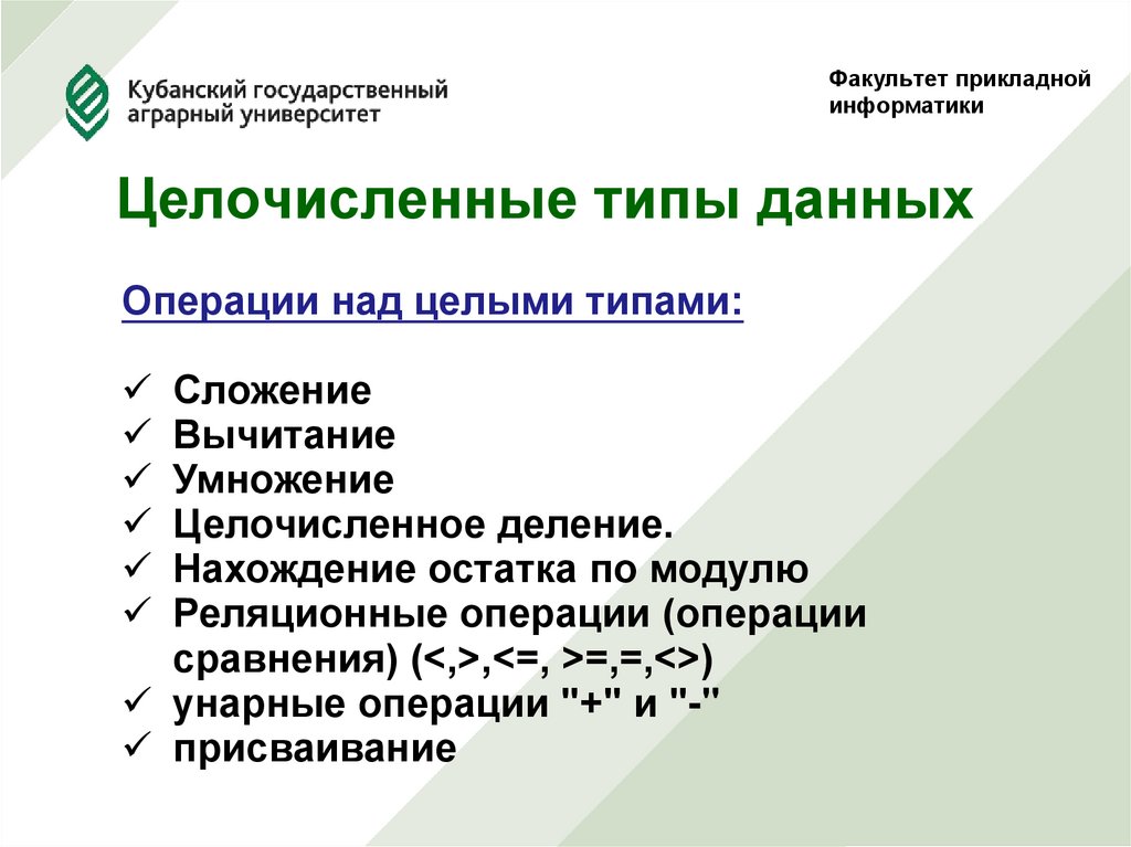 Целочисленные типы данныхОперации над целыми типами: