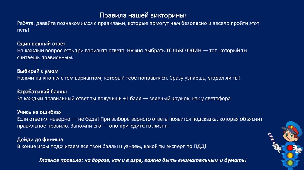 Правила нашей викторины!Ребята, давайте познакомимся с правилами, которые помогут нам безопасно и весело пройти этот