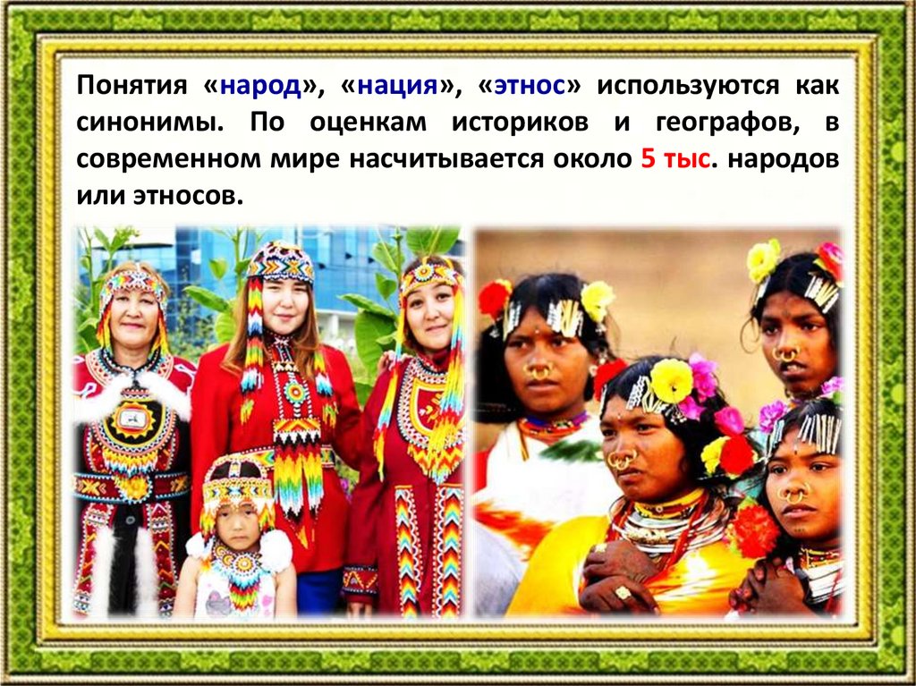 Понятия «народ», «нация», «этнос» используются каксинонимы. По оценкам историков и географов, в