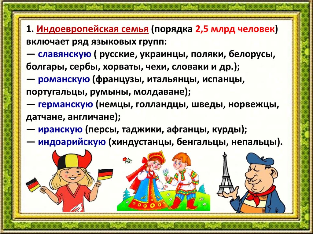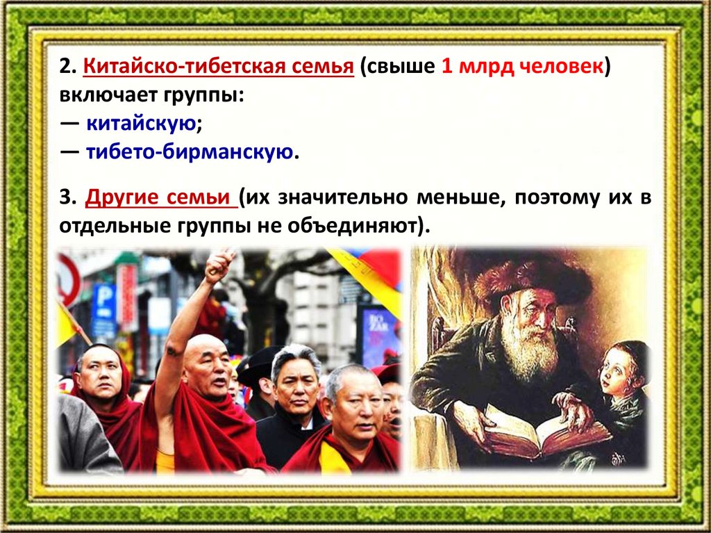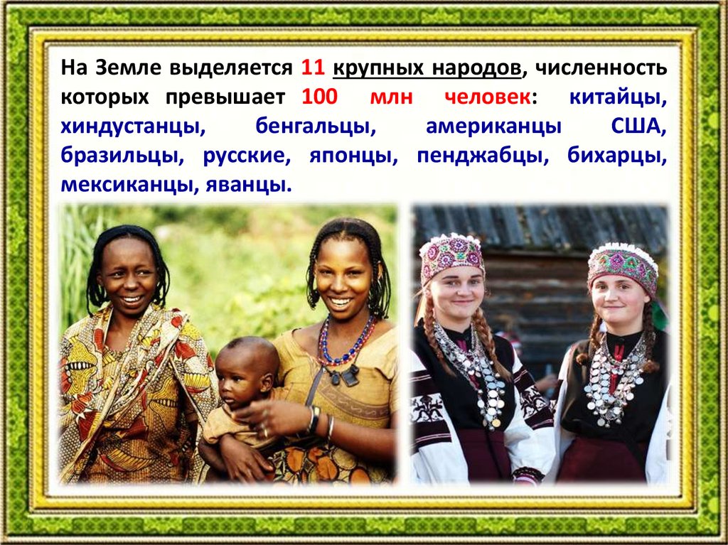 На Земле выделяется 11 крупных народов, численностькоторых превышает 100 млн человек: китайцы,