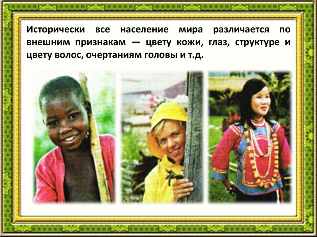 Исторически все население мира различается повнешним признакам — цвету кожи, глаз, структуре и