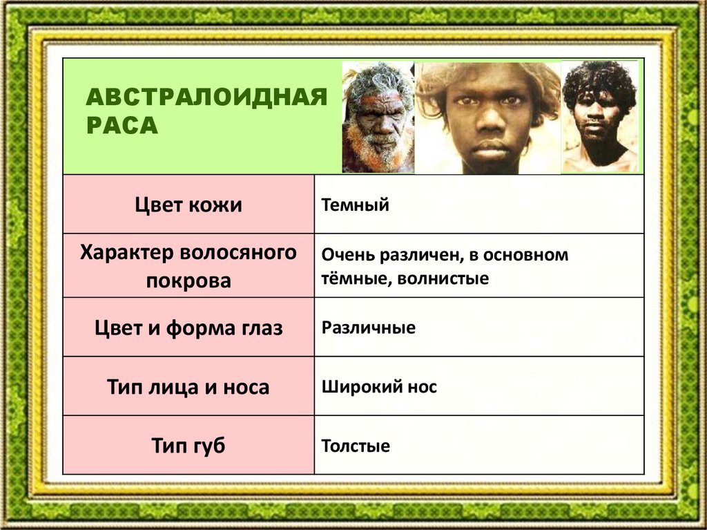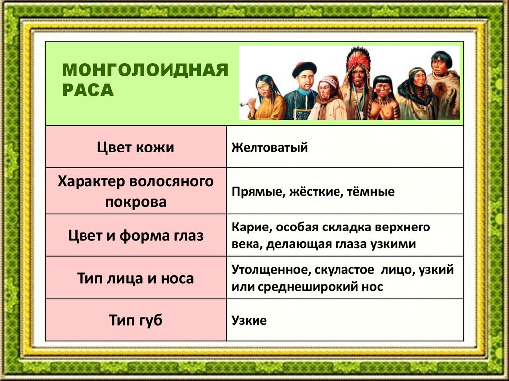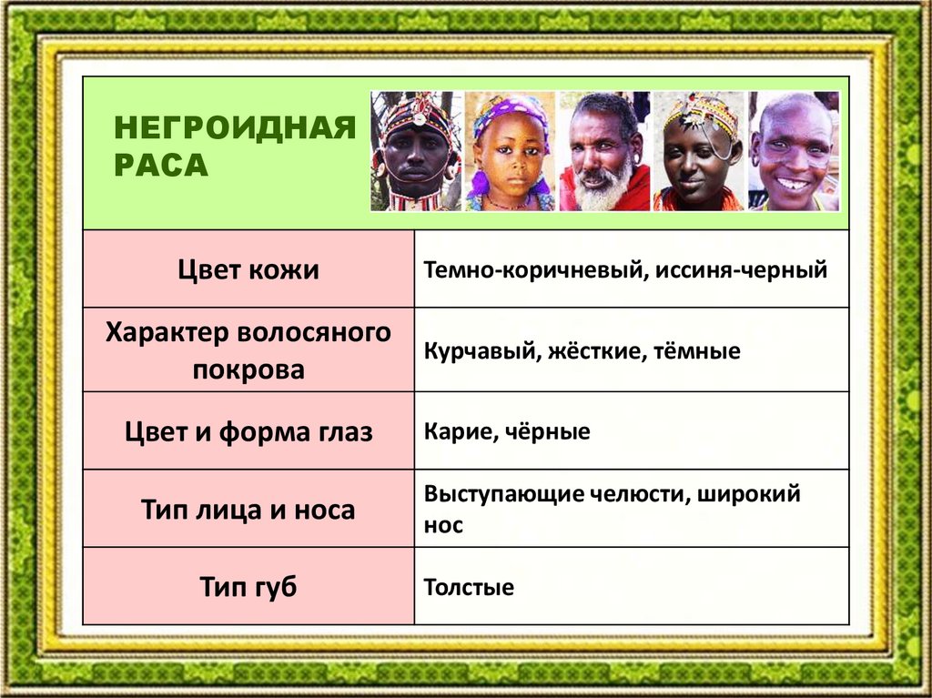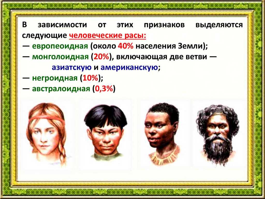 В зависимости от этих признаков выделяютсяследующие человеческие расы: