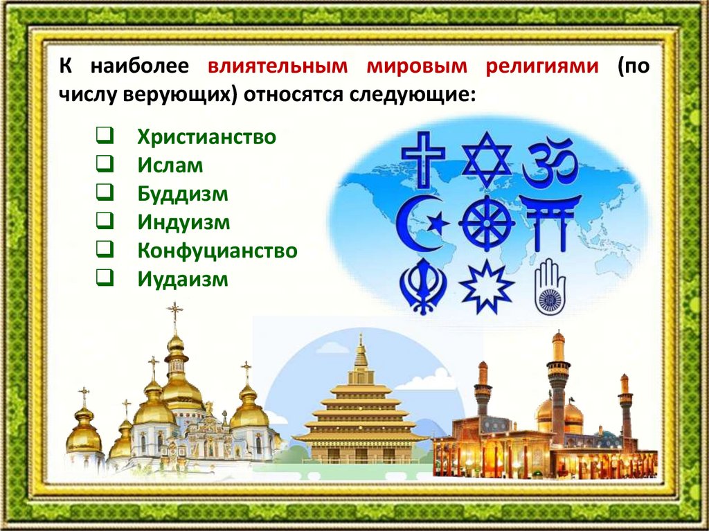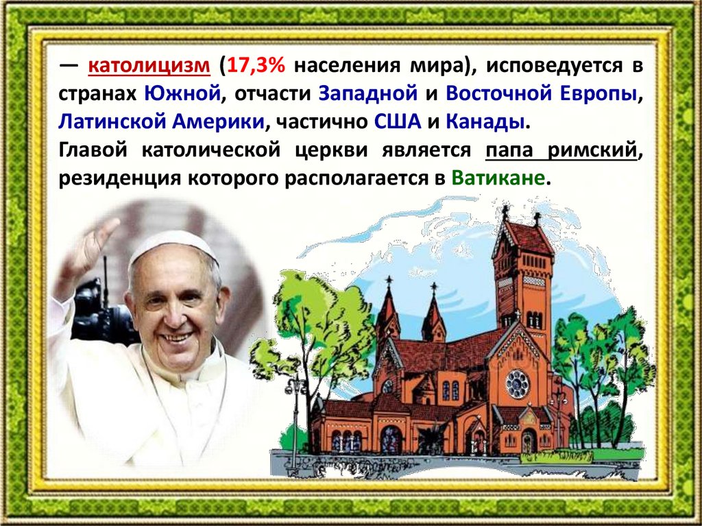 — католицизм (17,3% населения мира), исповедуется встранах Южной, отчасти Западной и Восточной Европы,