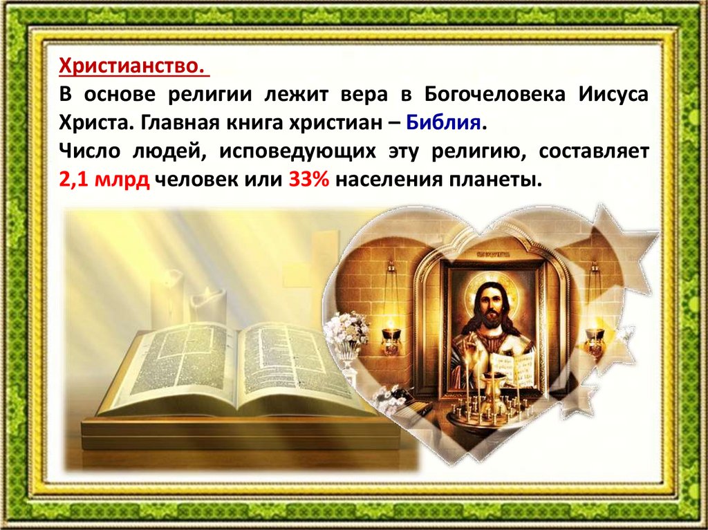 Христианство.В основе религии лежит вера в Богочеловека Иисуса