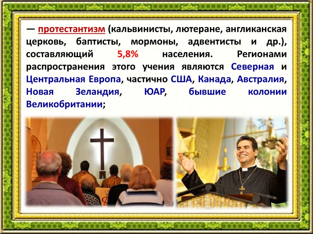 — протестантизм (кальвинисты, лютеране, англиканскаяцерковь, баптисты, мормоны, адвентисты и др.),