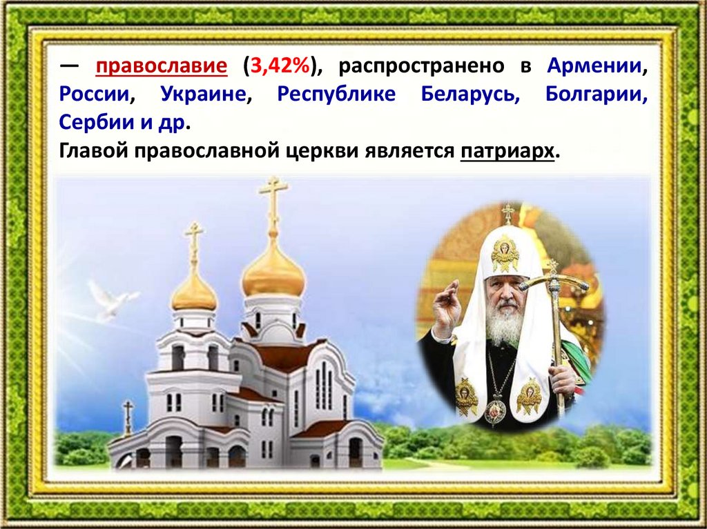 — православие (3,42%), распространено в Армении,России, Украине, Республике Беларусь, Болгарии,