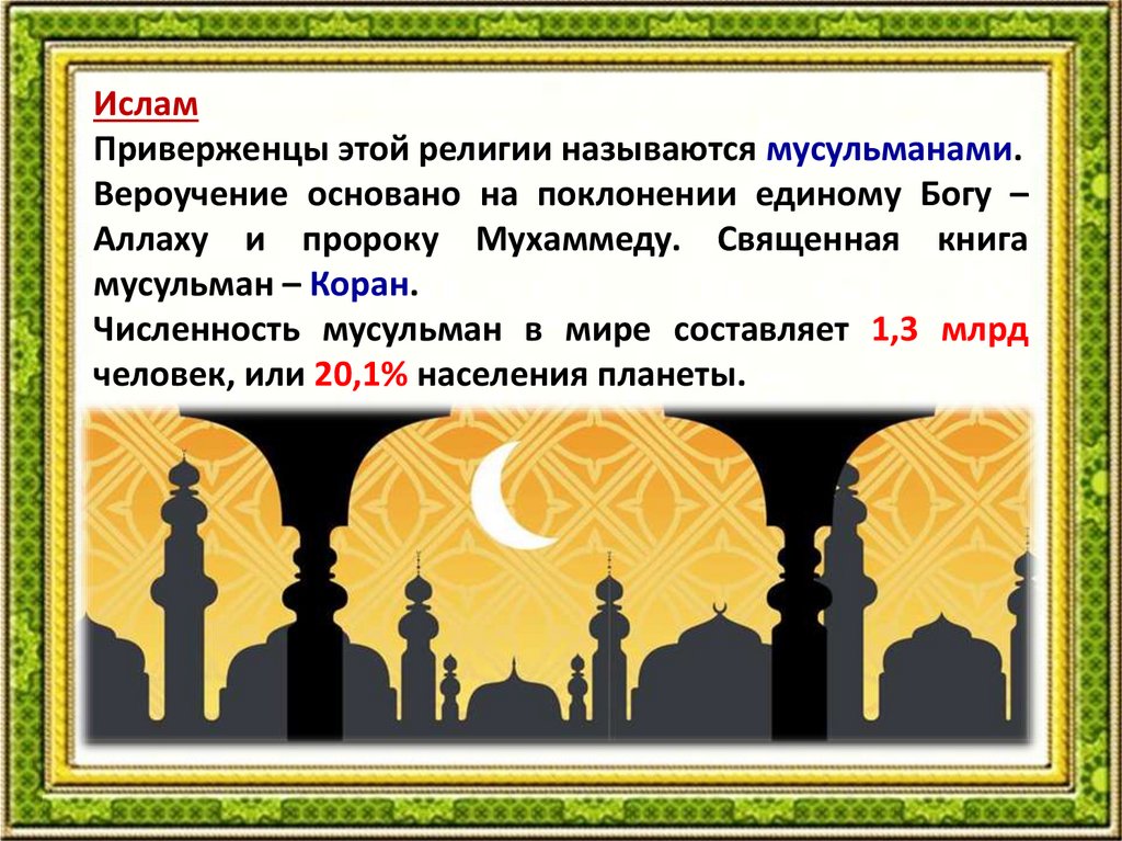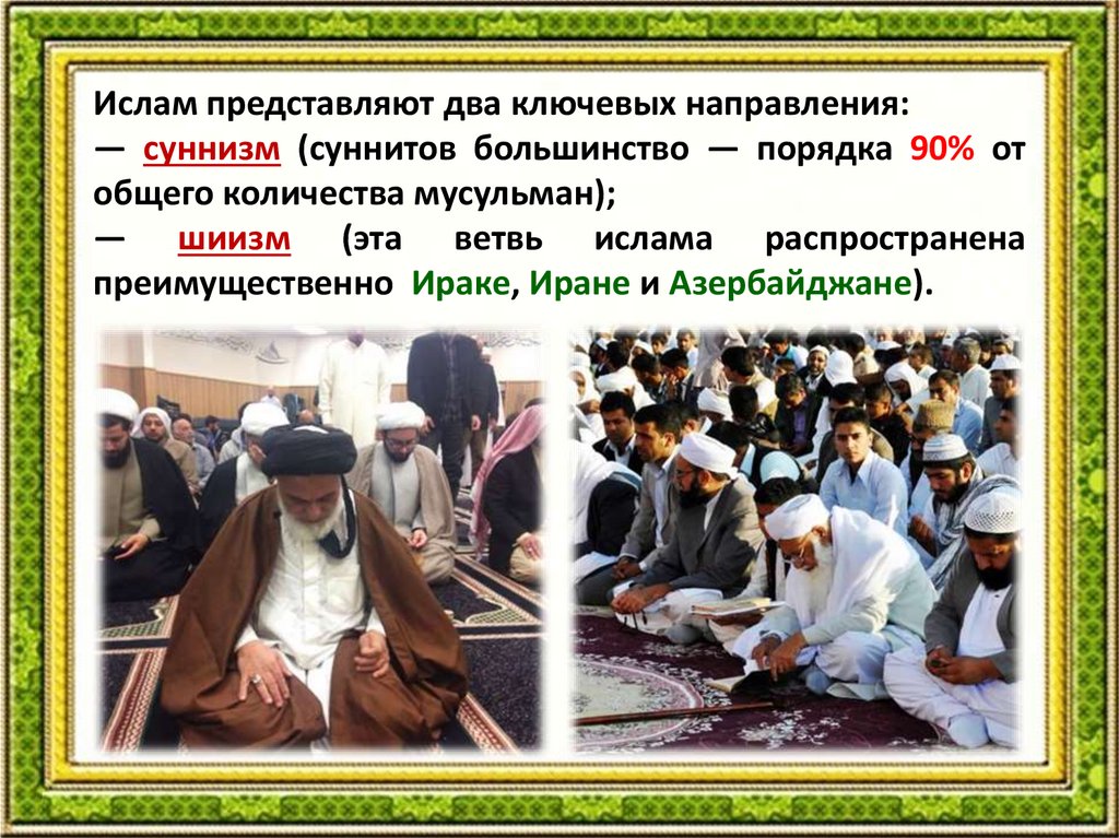 Ислам представляют два ключевых направления:— суннизм (суннитов большинство — порядка 90% от