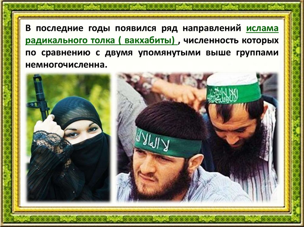 В последние годы появился ряд направлений исламарадикального толка ( вакхабиты) , численность которых