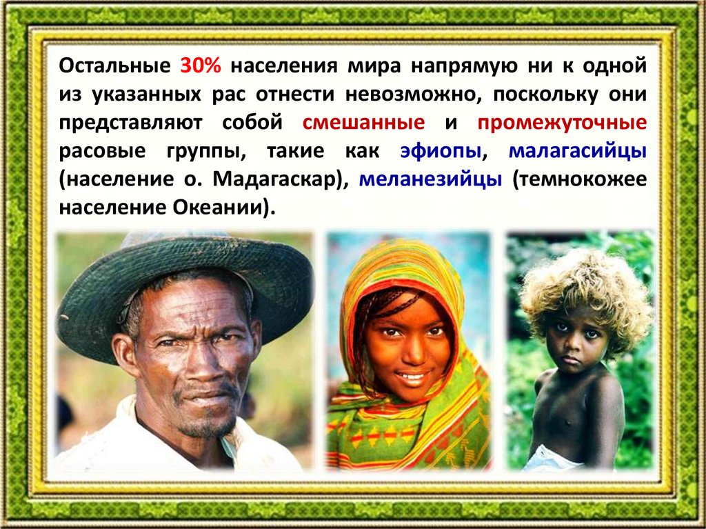 Остальные 30% населения мира напрямую ни к однойиз указанных рас отнести невозможно, поскольку они