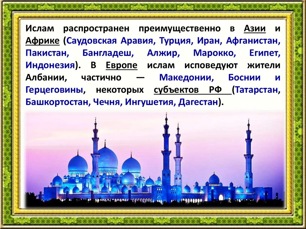 Ислам распространен преимущественно в Азии иАфрике (Саудовская Аравия, Турция, Иран, Афганистан,