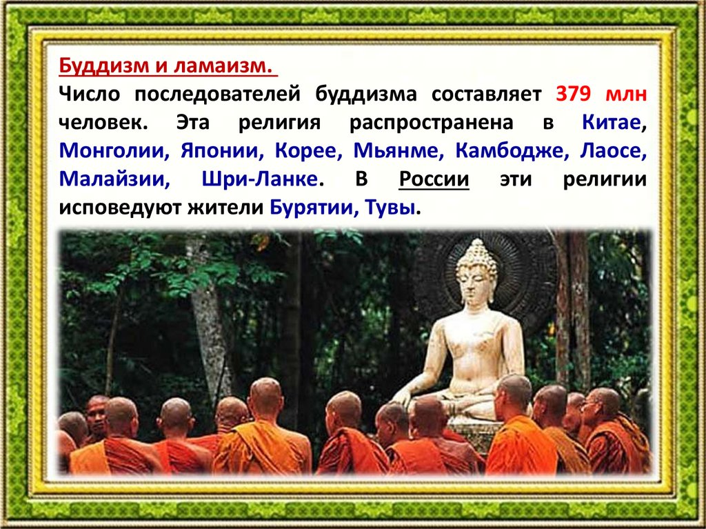Буддизм и ламаизм.Число последователей буддизма составляет 379 млн