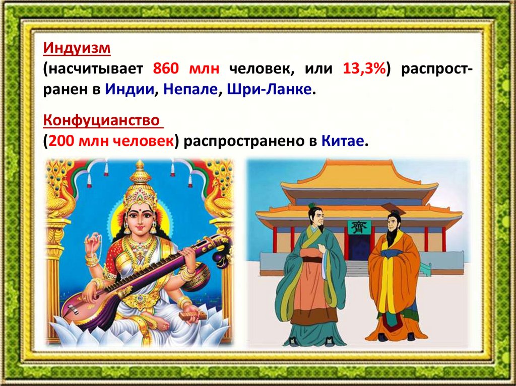 Индуизм(насчитывает 860 млн человек, или 13,3%) распространен в Индии, Непале, Шри-Ланке.