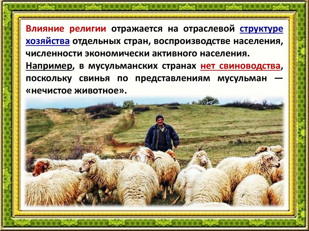 Влияние религии отражается на отраслевой структурехозяйства отдельных стран, воспроизводстве населения,