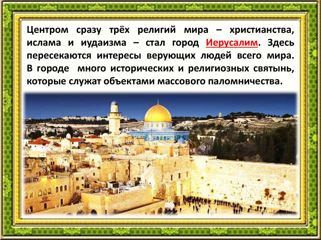 Центром сразу трёх религий мира – христианства,ислама и иудаизма – стал город Иерусалим. Здесь