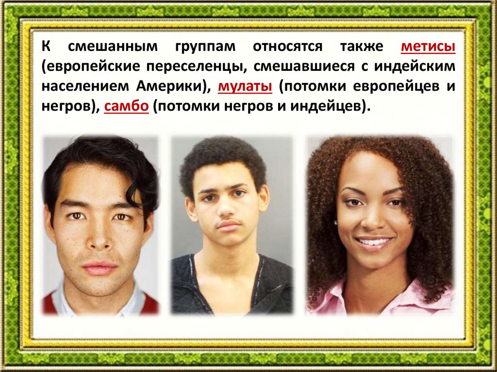 К смешанным группам относятся также метисы(европейские переселенцы, смешавшиеся с индейским