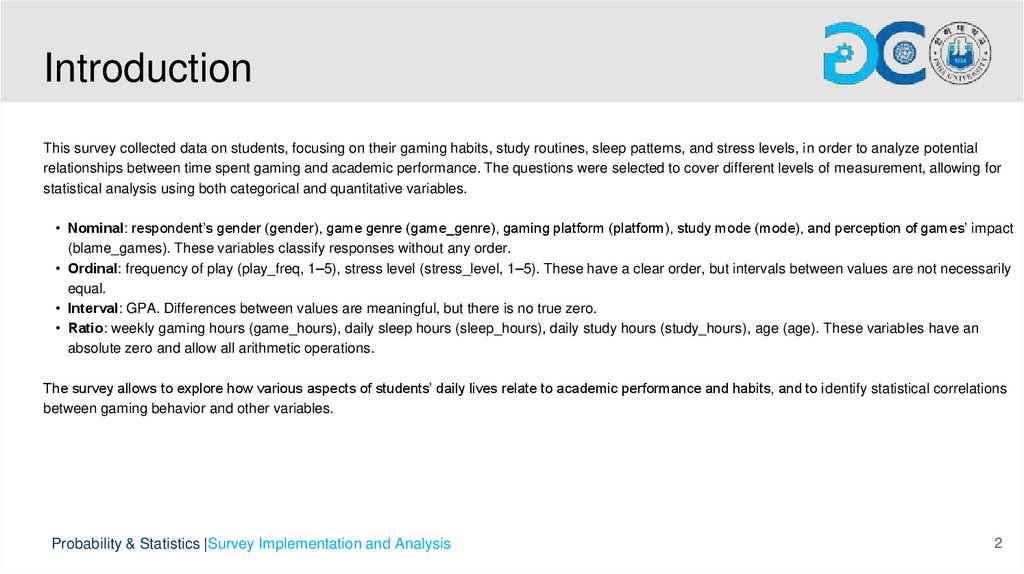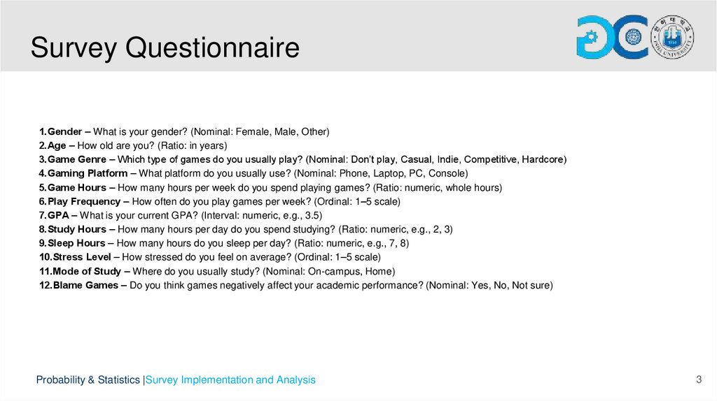 relationships between time spent gaming and academic performance. The questions were selected to cover different levels of measurement, allowing for
