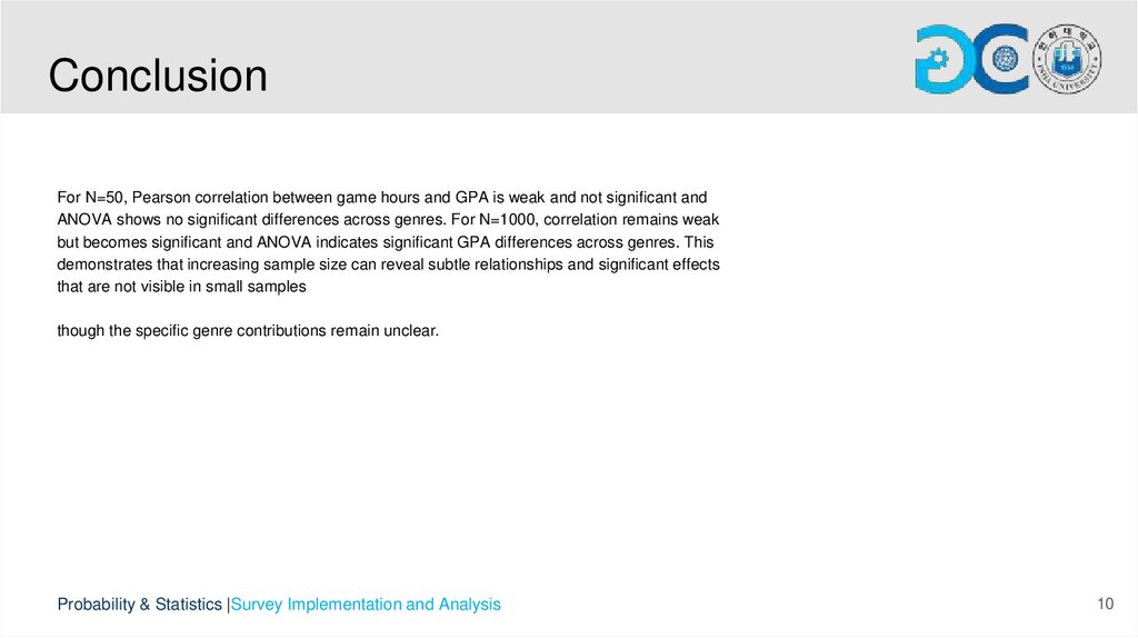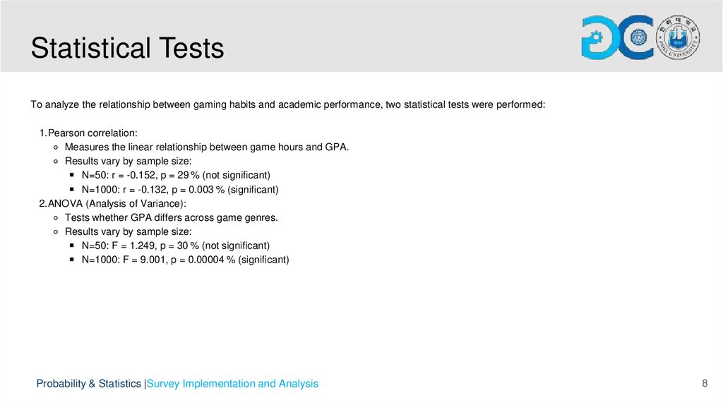 • ANOVA (Analysis of Variance) testing GPA differences across game genres: F=1.249,p=0.3033