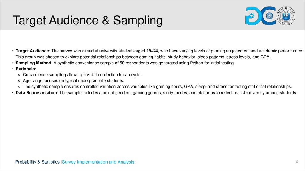 Target Audience & Sampling• Target Audience: The survey was aimed at university students aged 19–24, who have varying levels of gaming engagement and academic performance.