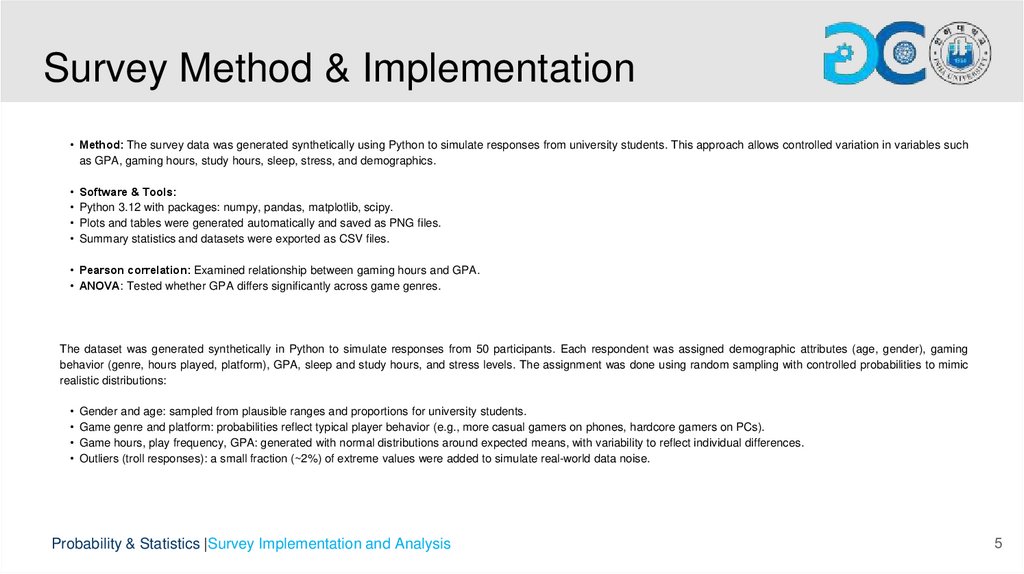 Survey Method & Implementation• Method: The survey data was generated synthetically using Python to simulate responses from university students. This approach allows controlled variation in variables such