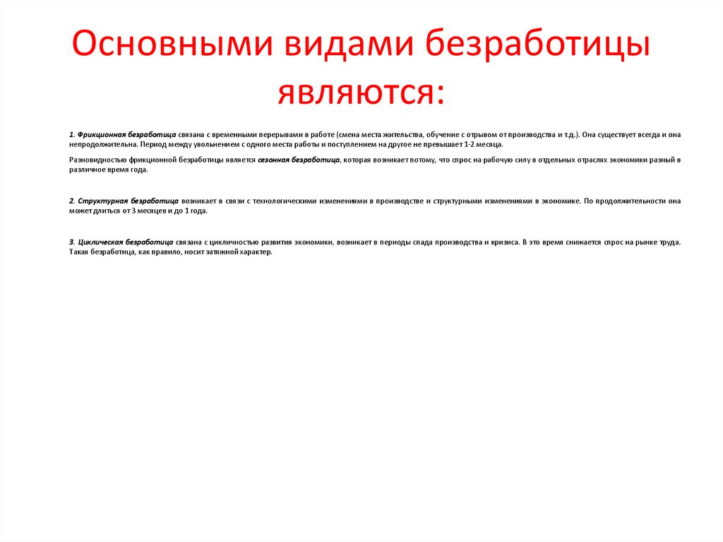 1. Фрикционная безработица связана с временными перерывами в работе (смена места жительства, обучение с отрывом от производства и т.д.). Она существует всегда и она