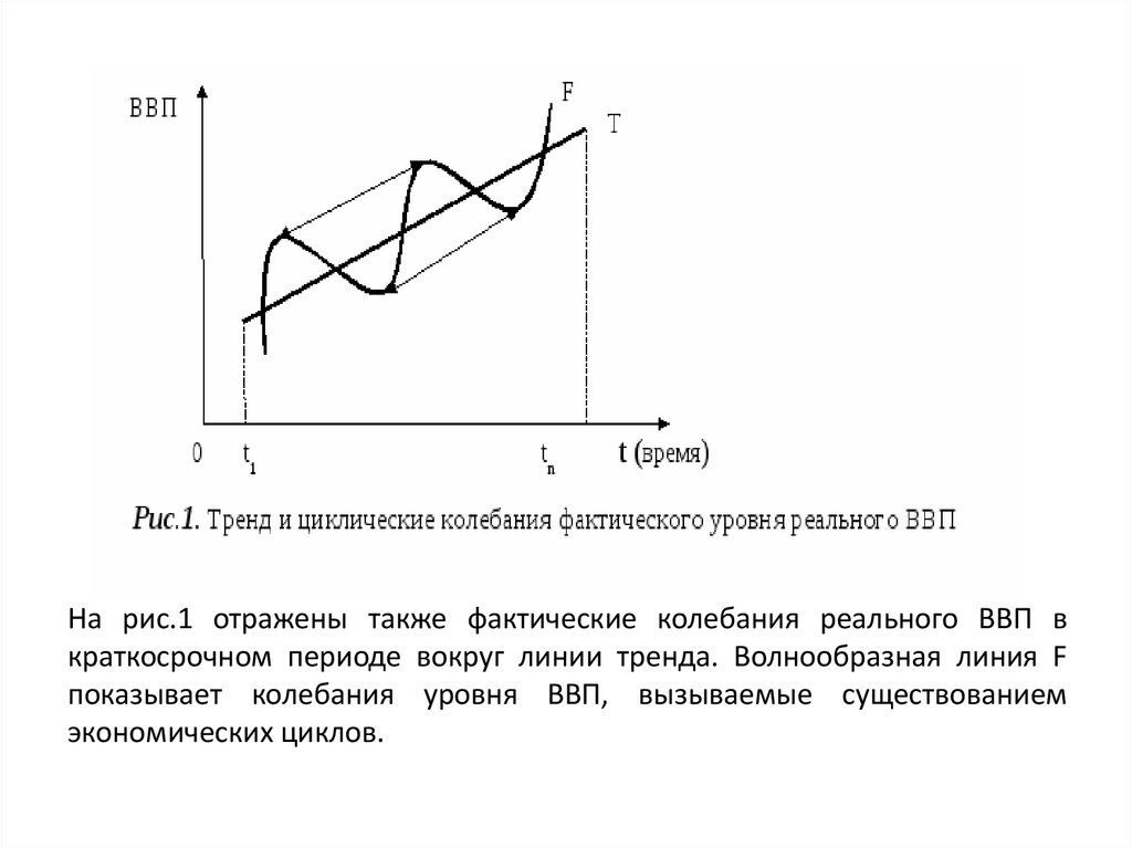 На рис.1 отражены также фактические колебания реального ВВП вкраткосрочном периоде вокруг линии тренда. Волнообразная линия F