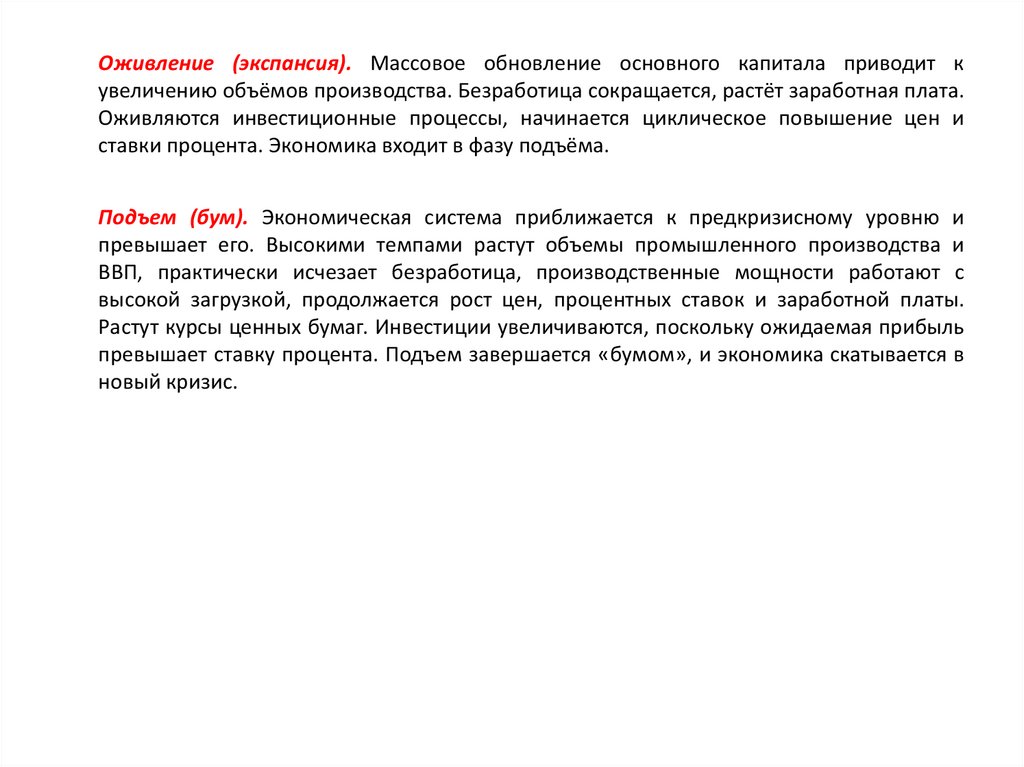 Оживление (экспансия). Массовое обновление основного капитала приводит кувеличению объёмов производства. Безработица сокращается, растёт заработная плата.