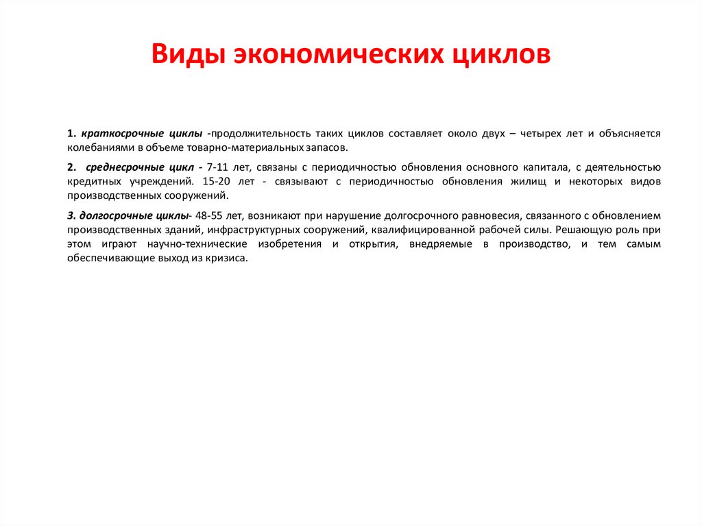 Виды экономических циклов1. краткосрочные циклы -продолжительность таких циклов составляет около двух – четырех лет и объясняется