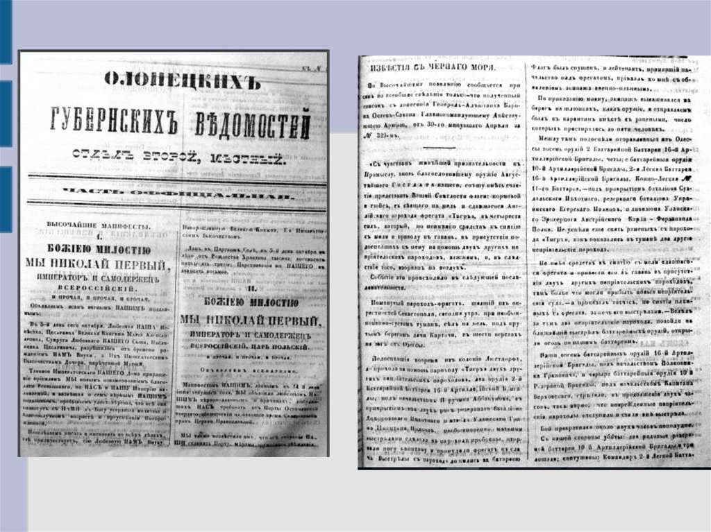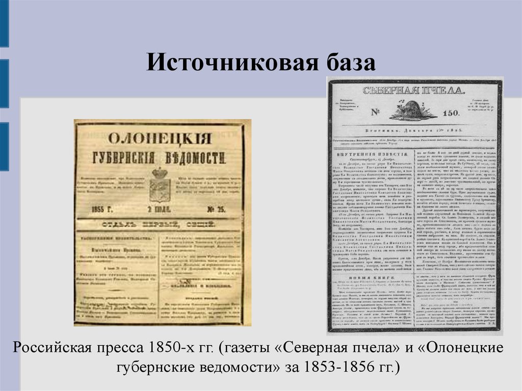 Источниковая базаРоссийская пресса 1850-х гг. (газеты «Северная пчела» и «Олонецкие