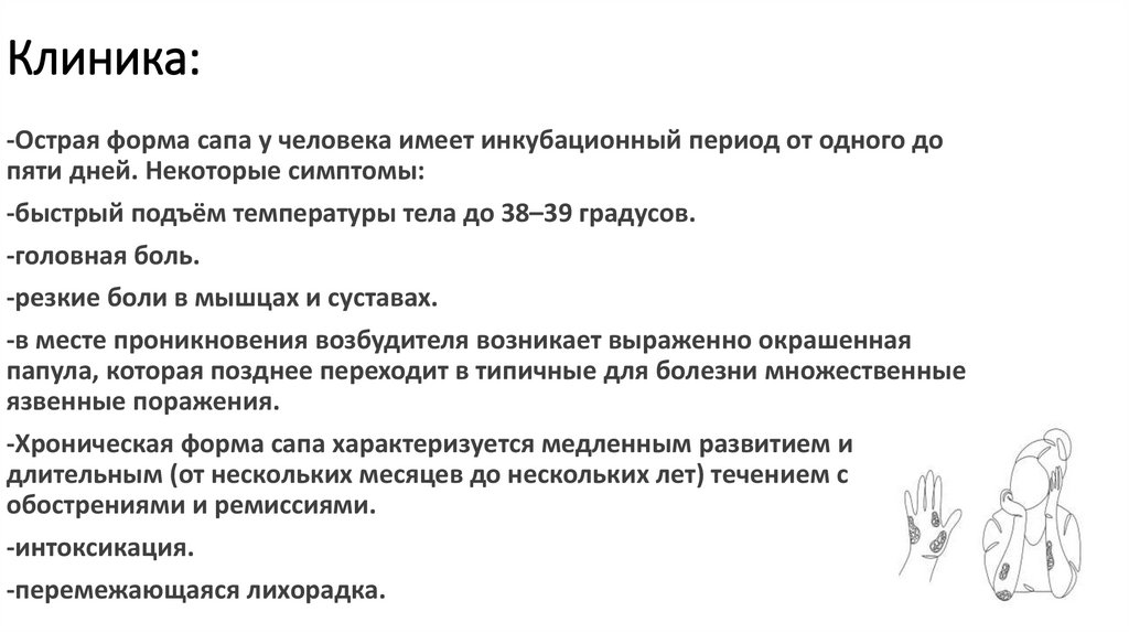 Клиника:-Острая форма сапа у человека имеет инкубационный период от одного до