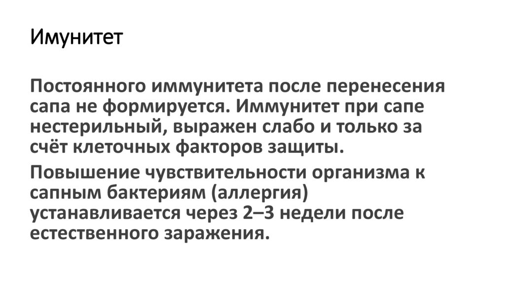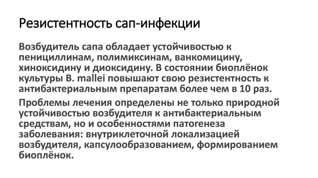 Резистентность сап-инфекцииВозбудитель сапа обладает устойчивостью к