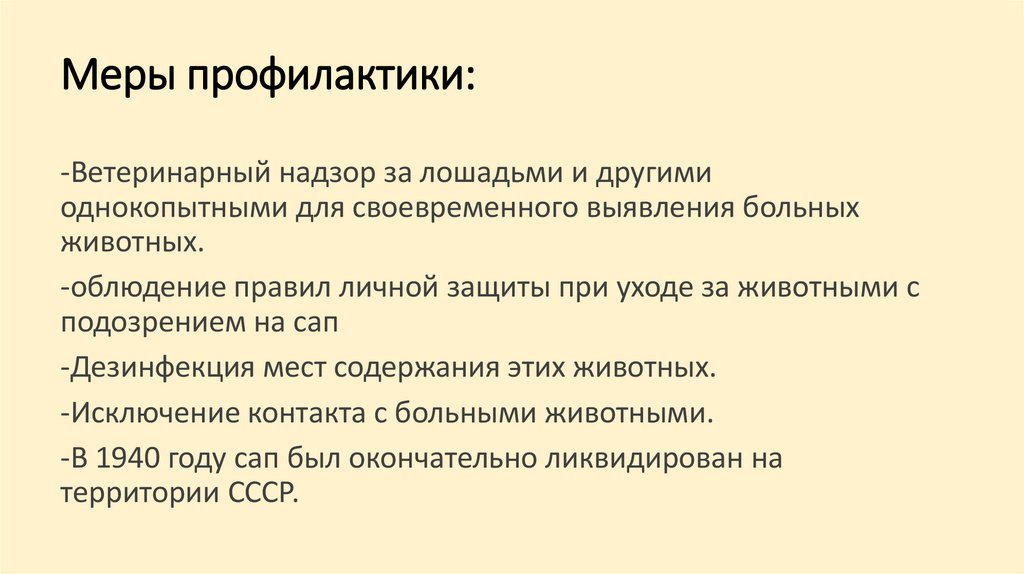 Меры профилактики:-Ветеринарный надзор за лошадьми и другими