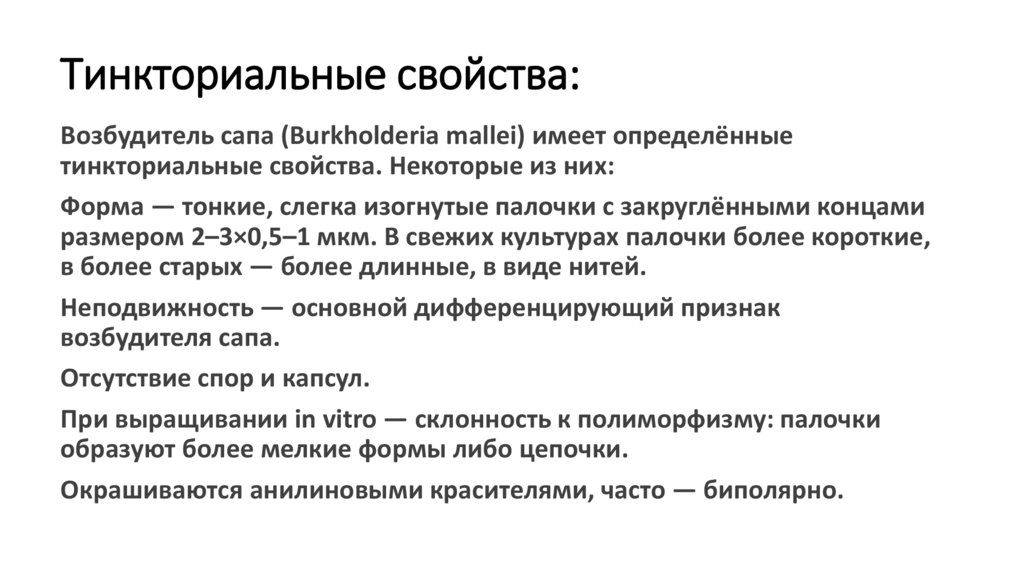 Тинкториальные свойства:Возбудитель сапа (Burkholderia mallei) имеет определённые
