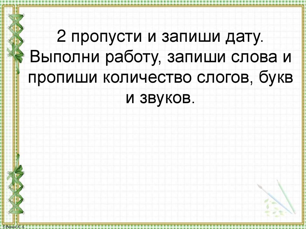 2 пропусти и запиши дату. Выполни работу, запиши слова и пропиши количество слогов, букв и звуков.