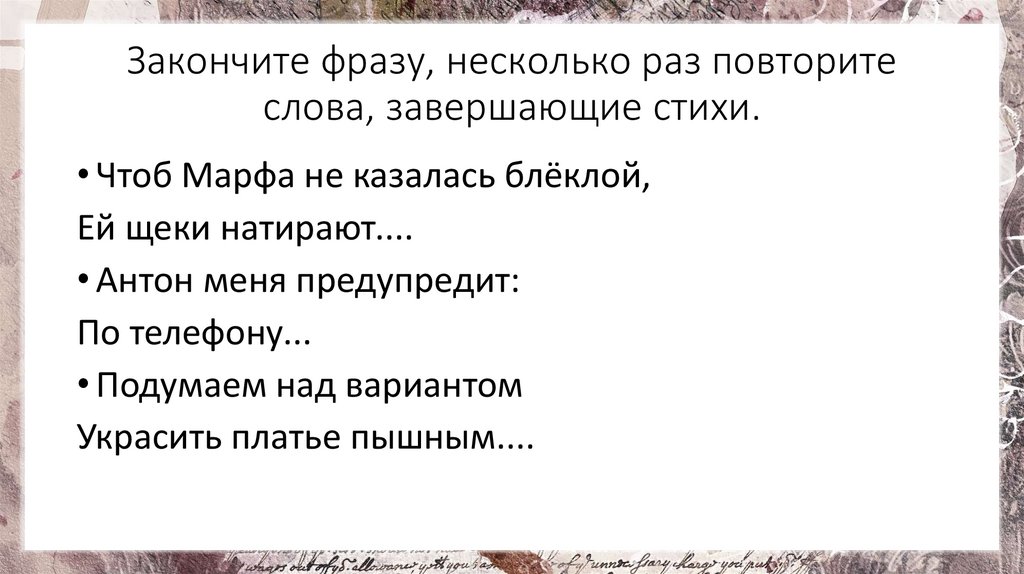 1. Закончите фразу, несколько раз повторите слова, завершающие стихи.