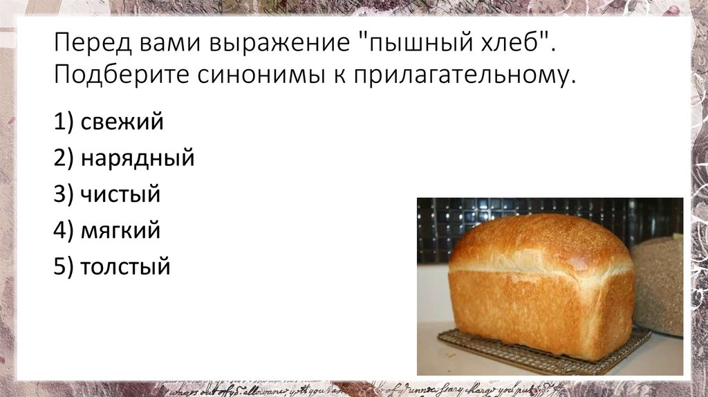 18. Перед вами выражение "пышный хлеб". Подберите синонимы к прилагательному.