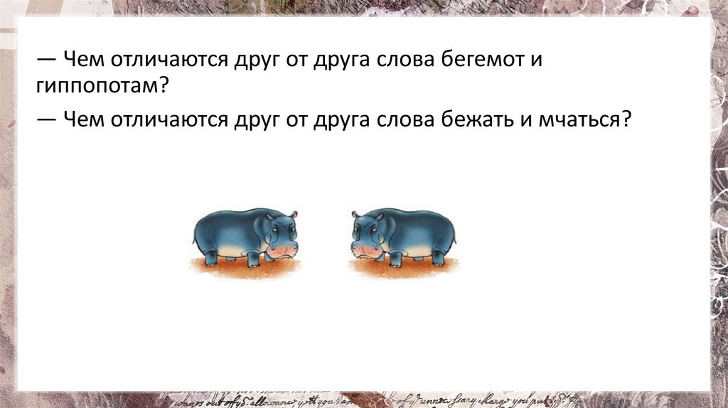— Чем отличаются друг от друга слова бегемот игиппопотам?