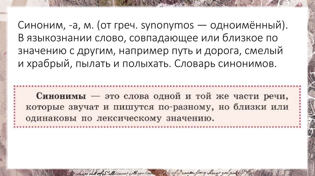 6. Синоним, -а, м. (от греч. synonymos — одноимённый). В языкознании слово, совпадающее или близкое по значению с другим, например