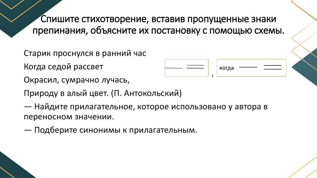 1. Спишите стихотворение, вставив пропущенные знаки препинания, объясните их постановку с помощью схемы.