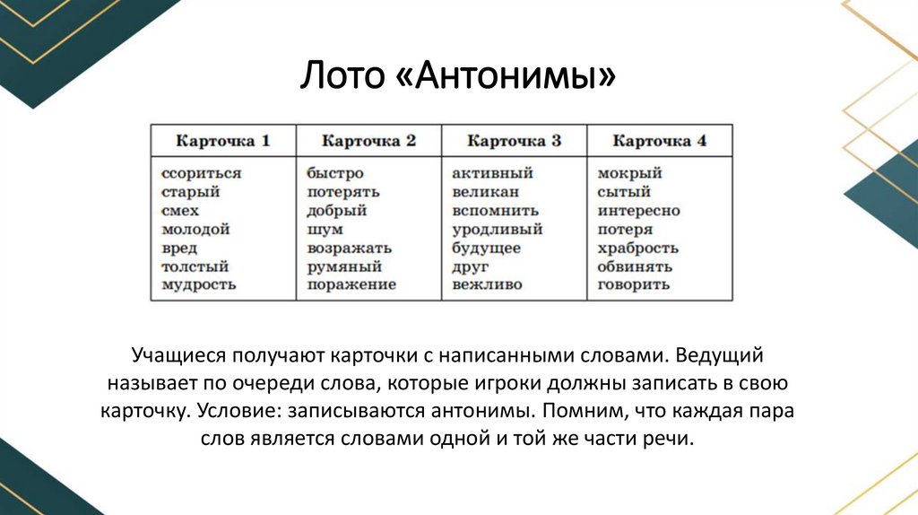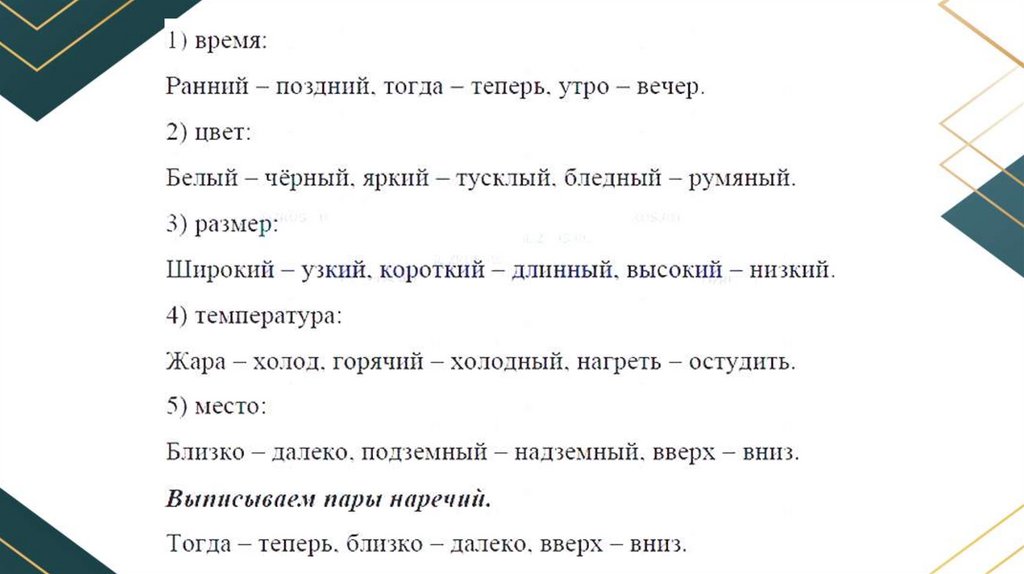 карточку. Условие: записываются антонимы. Помним, что каждая пара