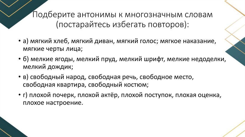15. Подберите антонимы к многозначным словам (постарайтесь избегать повторов):