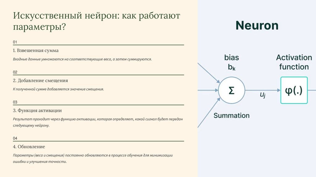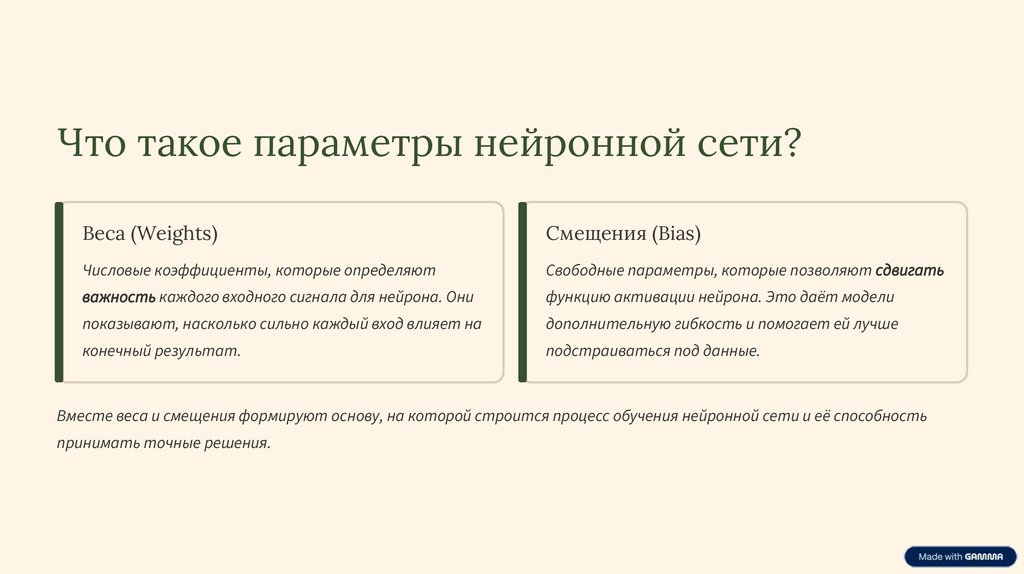 Вместе веса и смещения формируют основу, на которой строится процесс обучения нейронной сети и её способность