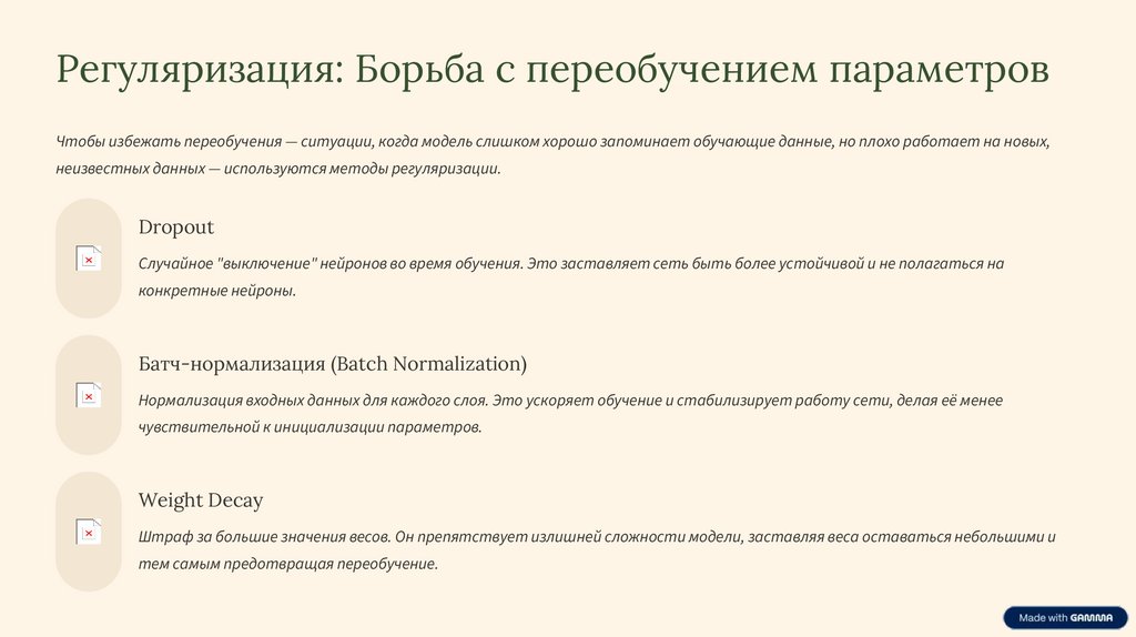 Регуляризация: Борьба с переобучением параметровЧтобы избежать переобучения — ситуации, когда модель слишком хорошо запоминает обучающие данные, но плохо работает на новых,