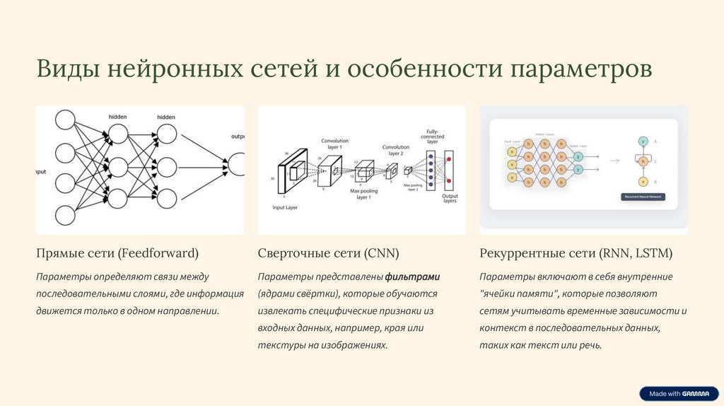 Виды нейронных сетей и особенности параметровПрямые сети (Feedforward)