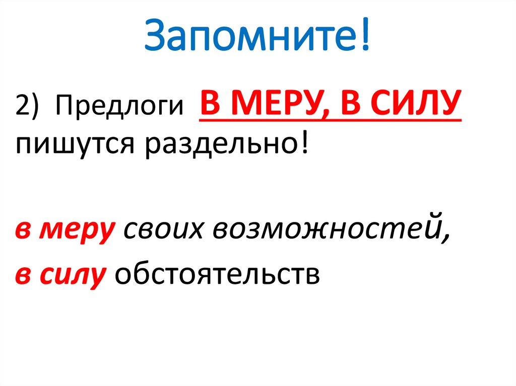 2) Предлоги В МЕРУ, В СИЛУпишутся раздельно!