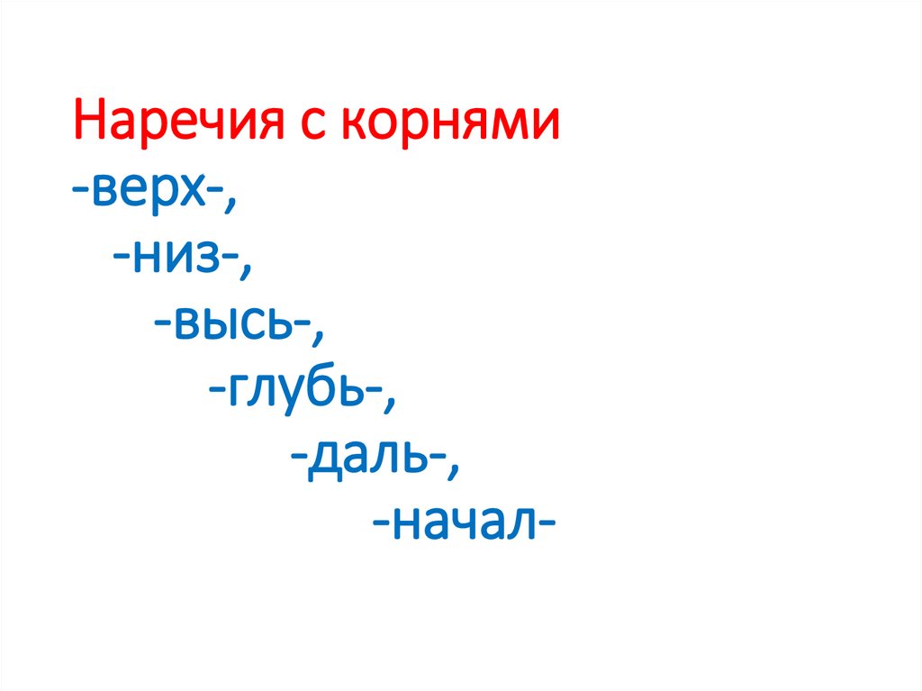 29. Наречия с корнями -верх-, -низ-, -высь-, -глубь-, -даль-, -начал-