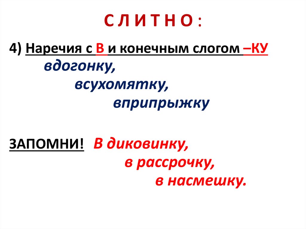 СЛИТНО:4) Наречия с В и конечным слогом –КУ