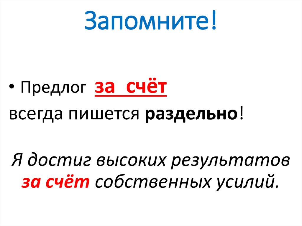 • Предлог за счётвсегда пишется раздельно!
